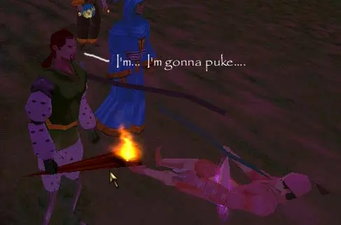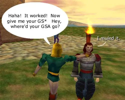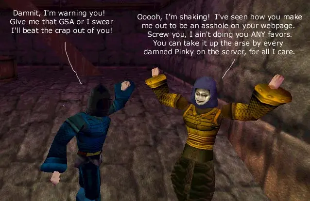 I ran out to Glendon Wood, where he was hanging out. I begged him to let me have it, to which I was laughed at quite profusely. After he got tired of doing the *point and laugh* emote (must have done it for an hour or so), he finally got tired of me still begging. Yelling at me and telling me no, he left me no option but to threaten him.