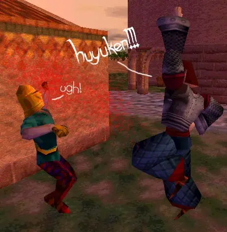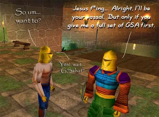 I challenged him to a duel. If I won, I’d get to borrow his GSA for my Pinky War, until he needed it back. He demanded that if I won a prize, then he should get a prize for winning as well. I felt confident that all my standing around begging for vassals had given me enough experience so that I could destroy him. So I let him name his prize.