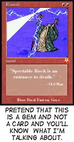 But don’t make them quests. Quests are boring and annoying. If there’s going to be a quest, make it for something REALLY special, like the sword of flaming dragons or something. No, these gems should drop at random from monsters. And when you fight bosses, you should get three gems. Some might be duplicates, some would be really rare… just one more reason to keep killing people.