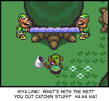 Play a flute to travel to the Dark World? Screw that noise. I’ll just kill people and slaughter their chickens and chop down their trees until THIS world becomes the Dark World! Then the Dark World will seem like a magical candy land filled with happy bunnies and that bitching stompy boot from Mario! Gannon will be jealous and want to come to MY Dark World. But to gain access, he’d have to play a stupid little flute, which I’m pretty sure would get him beaten to death by all his own minions. That, or he’d explode from… something. I mean, the guy’s supposed to be truly evil. What the hell is he doing playing that song??